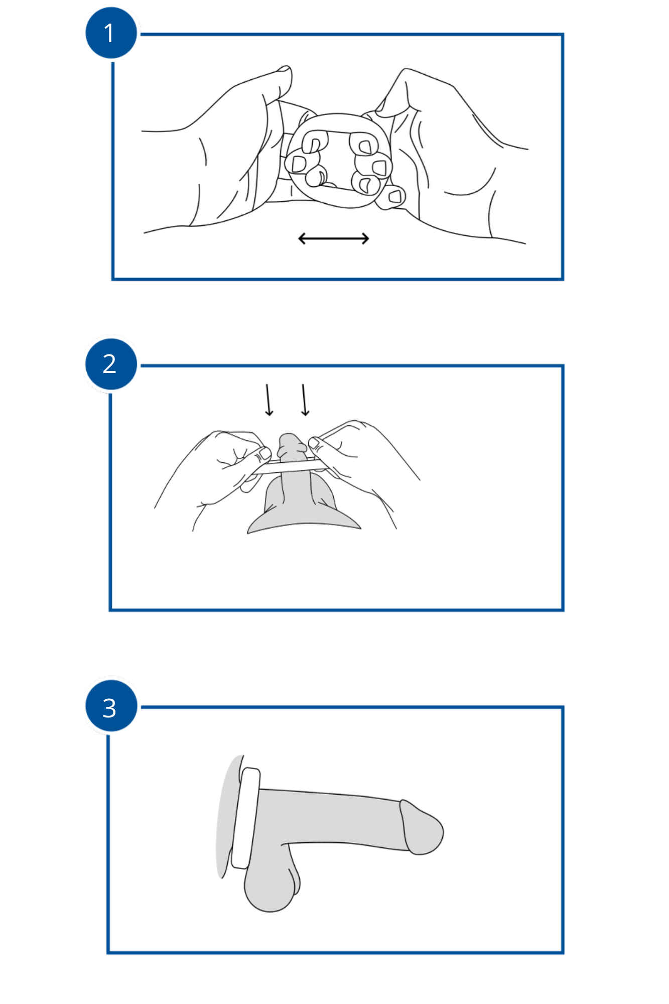 Po prostu rozsuń (rys. 1), nasuń na wyprostowanego penisa (rys. 2) i umieść za jądrami (rys. 3).